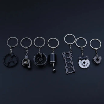 - Inhalt: 7x Schlüsselanhänger in verschiedenen Designs: 1x Turbolader, 1x Bremsscheibe, 1x Lenkrad, 1x Schalthebel, 1x Radnabe, 1x Motordichtung und 1x Rotor