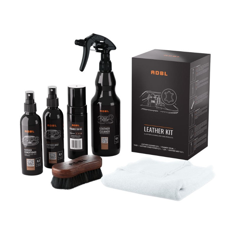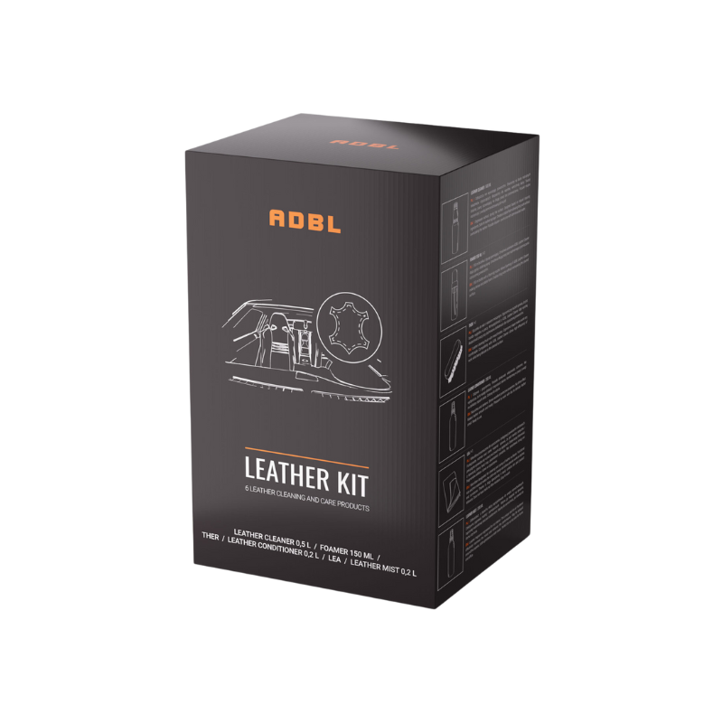 • Contents: 1x ADBL Leather Cleaner 500ml, 1x ADBL Empty Foaming Spray Bottle 150ml, 1x ADBL Leather Care 200ml, 1x ADBL Leather Mist Interior Fragrance Spray 200ml, 1x ADBL Leather Brush and 1x ADBL Microfiber Cloth (40 x 40cm / 340GSM)