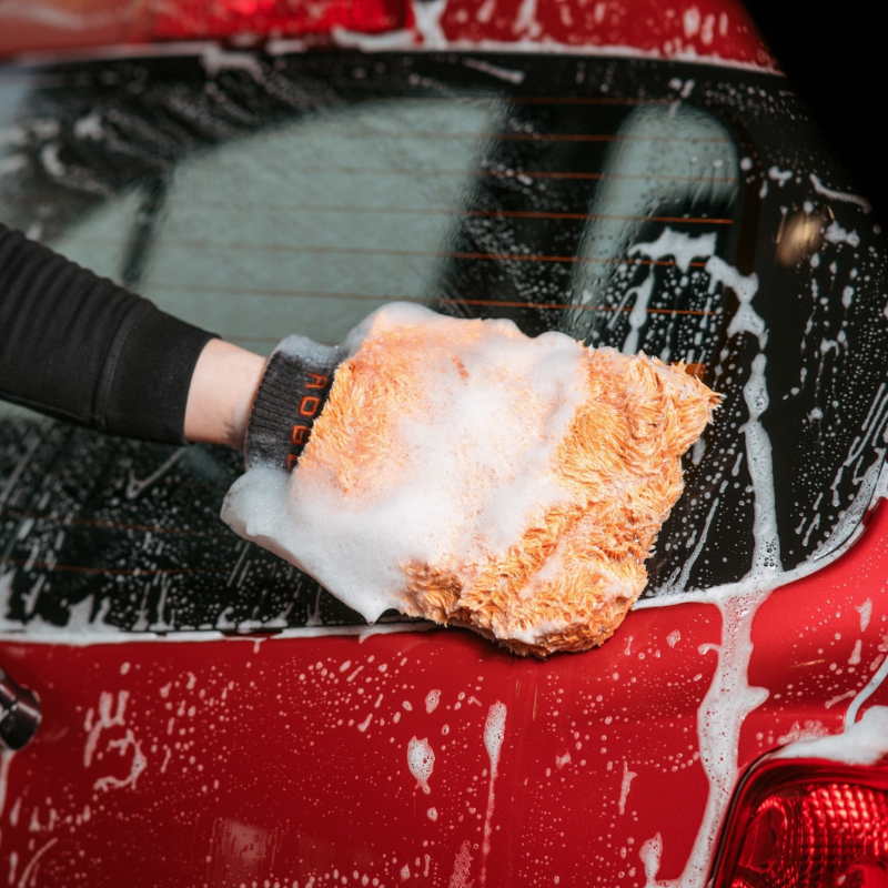 3. Handwäsche durchführen: 50 ml ADBL Snowball Autoshampoo in 10 Liter Wasser mischen und das Fahrzeug mit dem Mikrofaser Waschhandschuh von oben nach unten in geraden Bewegungen reinigen. Danach gründlich abspülen.